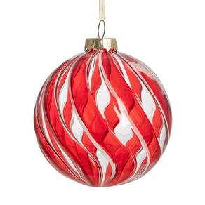 A Bola Holiday Stripes tem 8 cm de diâmetro e é produzida em vidro incolor, com pintura em vermelho e padronagem do característico doce alemão, a bengala. Ideal para pendurar na árvore de natal.