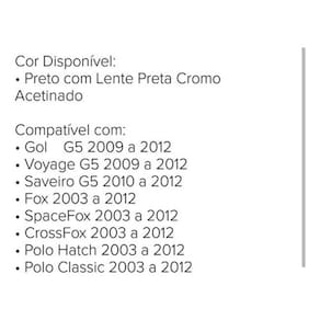 Descrição do produto Mais informações Marca: 60249 Descrição completa Manopla de câmbio gol voyage g5 09 10 11 12 saveiro g5 10 11 12 fox spacefox crossfox polo hatch polo classic 03 04 05 06 07 08 09 10 11 12 preto com lente preta Cor disponível: Preto com lente preta cromo acetinado Compatível com: Gol g5 2009 a 2012 Voyage g5 2009 a 2012 Fox 2003 a 2012 Spacefox 2003 a 2012 Crossfox 2003 a 2012 Polo hatch 2003 a 2012 Polo classic 2003 a 2012 Especificação técnica: Fabricada em plastico de alta resistência Disponível na cor preta com lente preta cromo acetinado Não é compatível com veículos com limitador de ré Instalação realizada através de encaixe Diâmetro aproximado do furo de encaixe: 1,3cm Dimensões aproximadas da manopla dxa : 5x12cm Conteúdo da embalagem: 01 manopla de câmbio Importante: de 3 meses. Valor unitário. Recomendamos que a instalação seja feita por um profissional especializado, pois não nos responsabilizamos pelo mau uso do produto. Agradecemos a sua visita Marca: Não Informado