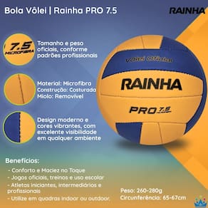 A Bola de Vôlei Rainha Oficial Pró 7.5 é a escolha perfeita para quem busca alto desempenho dentro das quadras. Desenvolvida com materiais de alta qualidade, ela oferece excelente controle, resistência e maciez ao toque tudo o que jogadores profissionais e amadores precisam para alcançar o melhor rendimento durante os treinos e competições.