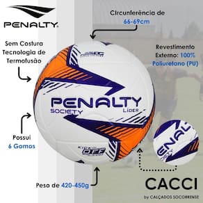 A Bola Society Penalty Líder conta com Câmara 6D com ótima resistência à retenção de ar, proporcionando equilíbrio total para a bola. E tem mais, com a tecnologia Cápsula SIS, seu miolo é lubrificado e substituível, além de bico alongado que envolve a agulha impedindo que perfure a câmara de ar.