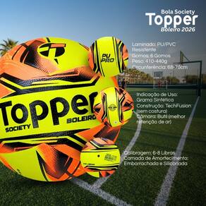 Características: - Marca: Topper - Modelo: Boleiro - Modalidade: Futebol Society - Material: PU/PVC resistente - Gomos: 6 Gomos - Peso: 410–440 g - Circunferência: 68–70 cm - Calibragem: 6-8 Libras - Tecnologia: TechFusion (sem costura) - Câmara interna: Borracha butílica (melhor retenção de ar) - Camada de Amortecimento: Emborrachada e Siliconada - Indicação de uso: Campos de grama sintética / society - Nível: Recreativo e amador