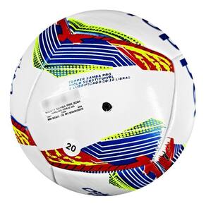 Revestimento: PU Pro Cores predominantes: Branco, Azul, Verde e Vermelho. Construção: Fusionada. Circunferência aproximada: 68 - 70 cm Peso aproximado: 410 - 440 g Gomos: 12 gomos Miolo: Substituível e Lubrificado