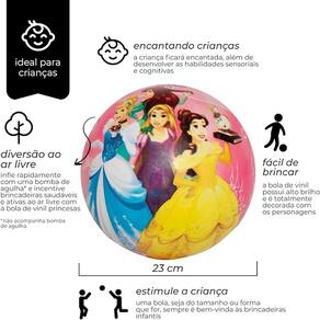 A Bola de Vinil Princesas da Zippy Toys vai conquistar a garotada!Feita em material leve, macio e emborrachado, é segura, fácil de ser erguida e arremessada e chutada Mede aproximadamente 23 centímetros de diâmetro, tamanho ideal para que crianças de três anos
