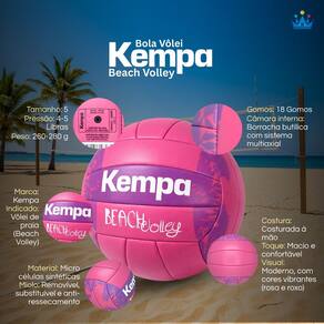 - Modalidade: Vôlei de praia (Beach Volley) - Marca: Kempa - Câmara interna: Borracha butílica com sistema multiaxial - Miolo: Removível, substituível e anti-ressecamento - Circunferência: 65 a 67 cm - Peso: 260 a 280 g - Gomos: 18 Gomos - Tamanho: 5 - Pressão: 4-5 Libras - Costura: Costurada à mão - Material: Micro células sintéticas - Toque: Macio e confortável - Visual: Moderno, com cores vibrantes (rosa e roxo) - Indicação: Vôlei de praia em nível profissional, amador e recreativo - Origem: Importada ( China )