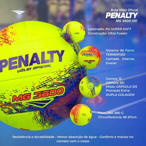 Benefícios: - Conforto e maciez no contato com o corpo. - Resistência e durabilidade. - Menor absorção de água. - Alguns diferenciais técnicos: - A Bola Vôlei MG 3600 Penalty XXI conta com a câmara Airbility 6D que proporciona precisão e controle absoluto durante os toques e jogadas. Seu peso e circunferência são ideais para utilizar com os amigos.