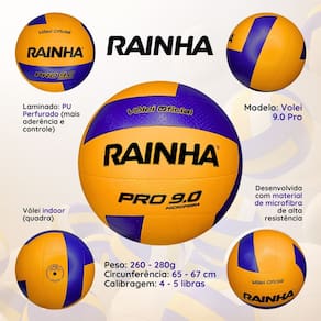 - Marca: Rainha - Modelo: Volei 9.0 Pro - Laminado: PU Perfurado (mais aderência e controle) - Peso: 260 - 280g - Circunferência: 65 - 67 cm - Calibragem: 4 - 5 libras