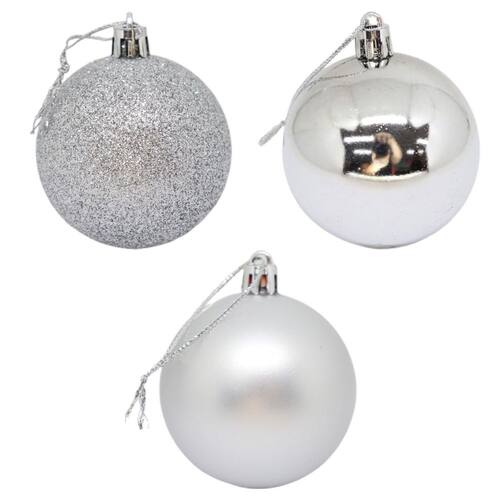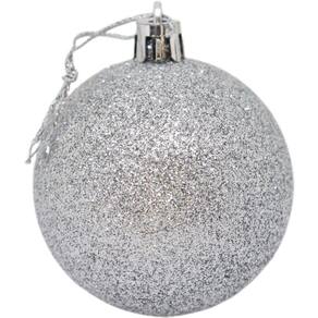 02 BOLAS LISAS. 02 BOLAS FOSCA. 02 BOLAS COM GLITER. COR: PRATA. TAMANHO: 6 CM. MARCA: KIT. PRODUTO IMPORTADO: CHINA.