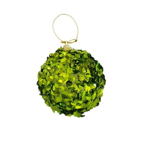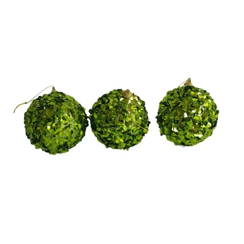 kit com 3 Bolas Decorativas de Natal na cor verde com 10cm de diâmetro, estrutura em EPS revestida com glitter e lantejoulas verdes.