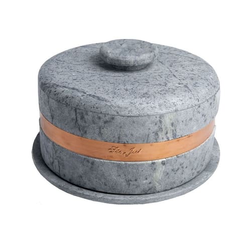 Boleira em pedra sabão com acabamento em cobre. Mantém a temperatura por mais tempo, conservando textura e sabor. Visual rústico sofisticado. Ideal para servir bolos, tortas e sobremesas.Bica móvel