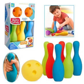 • Com o boliche de vinil Cometa Se a criança terá uma brincadeira que estimula o movimento, a coordenação motora e ainda garante boas risadas, o Jogo de Boliche Cometa é a escolha perfeita! Ideal para crianças a partir de 3 anos, esse brinquedo encanta com seus pinos coloridos e super macios.