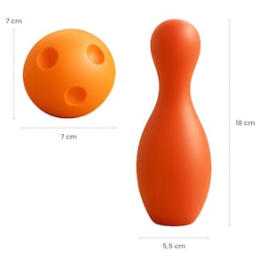 • Feito para crianças a partir de 3 anos, este jogo de boliche com 6 pinos e 2 bolas, todos feitos em vinil macio para segurança e diversão garantida! Ideal para promover habilidades motoras e coordenação, dentro ou fora de casa.