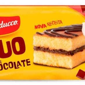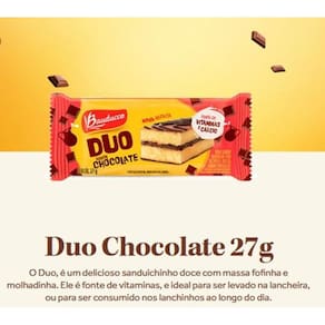 O Duo, é um delicioso sanduichinho doce com massa fofinha e molhadinha. Ele é fonte de vitaminas, e ideal para ser levado na lancheira, ou para ser consumido nos lanchinhos ao longo do dia. Minibolo Duo Chocolate 27g com 15. Marca: Bauducco