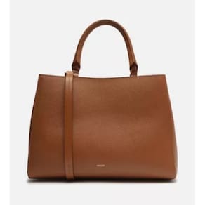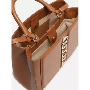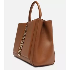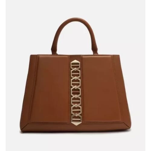 Descrição: Bolsa tote grande de couro marrom. O modelo tem formato quadrado e estruturado e laterais arredondadas. Traz alça de mão bombada, alça lateral regulável e fecho superior em imã. Com detalhe em costuras na capa frontal e peças de metal entrelaçadas.