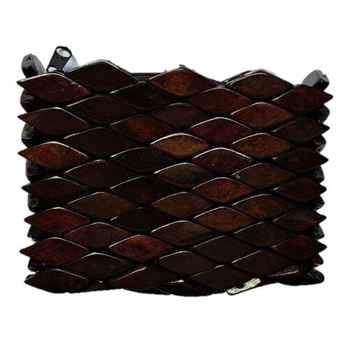 Bolsa confeccionada com pecinhas de madeira no formato de pequenos losângulos, pintados e envernizados, na cor marrom escura, com acabamento interno em cetim e fechamento com zíper.