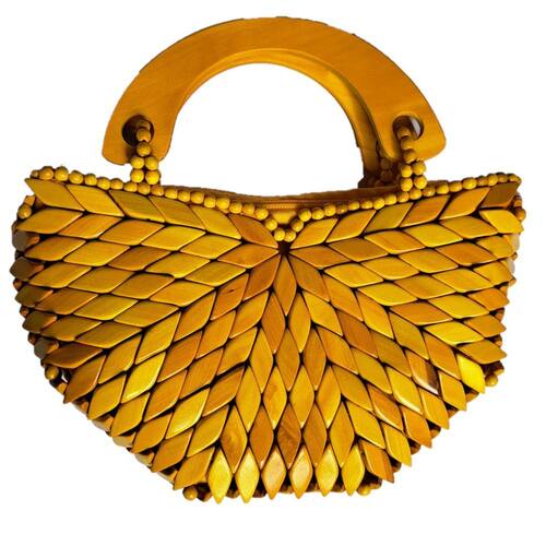 Bolsa confeccionada com pecinhas de madeira no formato de pequenos losângulos, pintados e envernizados, Amarela, com acabamento interno em cetim e fechamento com zíper. Alça CURTA de MADEIRA formato meia lua com 18 cm diâmetro. A bolsa é arredondada em formato de meia lua com profundidade de 6 cm.