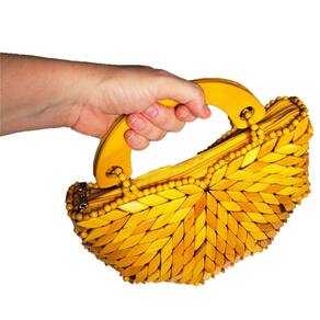 Bolsa Artesanal Peças Madeira Envernizada Amarela, Meia Lua, com Zíper e interior em tecido cetim