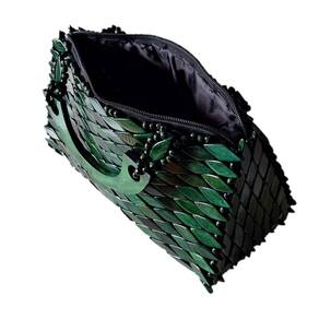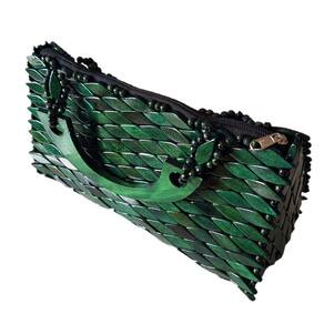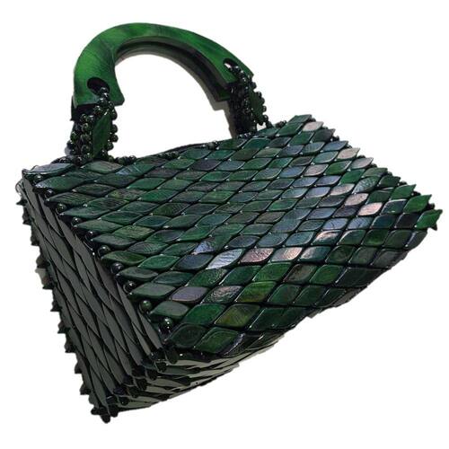 Bolsa confeccionada com pecinhas de madeira no formato de pequenos losângulos, pintados e envernizados, na cor Verde, com acabamento interno em cetim preto e fechamento com zíper. Alça CURTA de MADEIRA formato meia lua com 16 cm diâmetro.