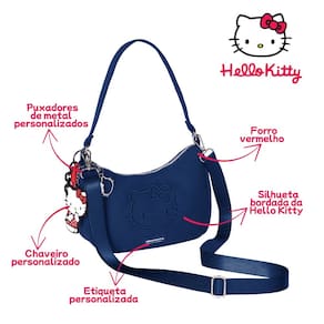 Características Bolsa: - Confeccionada em nylon - Silhueta bordada da Hello Kitty - Puxadores de metal personalizados - Forro personalizado - Chaveiro personalizado - Etiqueta em patch de PVC silkado