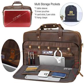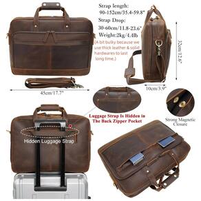 Alça de Bagagem Conversível: Durante longas viagens de negócios, você pode abrir os zíperes do bolso traseiro com zíper para permitir que seja uma alça de bagagem para pendurar a maleta na mala com rodinhas para liberar a fadiga do transporte e tornar a viagem mais fácil. No dia a dia, feche os zíperes para usar como bolso. A bolsa de couro pode ser transportada como bolsa de alça superior, pasta para laptop de 17", bolsa de escritório para trabalho comercial, bolsa mensageiro de viagem, bolsa de ombro diária, pasta de professor ou advogado.