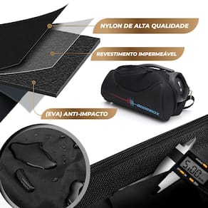 ESPECIFICAÇÕES TÉCNICAS: MATERIAL EXTERNO: Nylon Reforçado Impermeável Cor EXCLUSIVA PREENCHIMENTO: EVA de alta densidade de 5mm MATERIAL INTERNO: Forro Poliéster Atoalhado na cor Laranja ALÇAS: Fita de Poliéster Ultra resistente com regulagem e Mosquetão de fixação BOLSO: Neoprene com Elasticidade e impermeável FECHAMENTO: Zíper de alta resistência