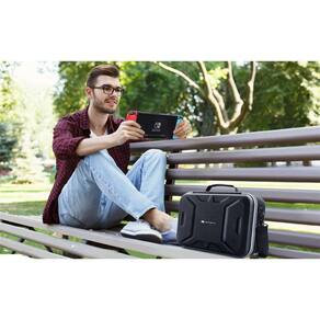 Esta bolsa é um item essencial para você guardar e transportar seu Nintedo Switch com segurança e tranquilidade, pois possui interior com compartimentos próprios em EVA para cada acessório e o console.