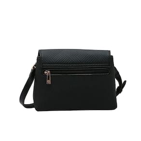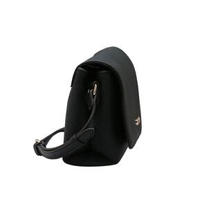 Com design estruturado e acabamento texturizado, apresenta fecho com tampa frontal e detalhes metálicos dourados que contém um