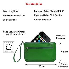 Bolsa clutch, carteira de mão e porta celular em COURO 100% autêntico, muito versátil e prática, possui 1 bolso externo fechado por zíper para pequenos objetos, todos os metais (argola, mosquetões, zíperes, etc) são na cor prata. O fechamento principal é feito com zíper em nylon de fácil deslize. Possui alça externa de mão, excelente para uso no dia a dia. Possui a medida ideal para levar pequenos objetos, carteiras pequenas, celulares de tamanhos médio e grande, etc.