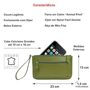 Bolsa clutch, carteira de mão e porta celular em COURO 100% autêntico, muito versátil e prática, possui 1 bolso externo fechado por zíper para pequenos objetos, todos os metais (argola, mosquetões, zíperes, etc) são na cor prata. O fechamento principal é feito com zíper em nylon de fácil deslize. Possui alça externa de mão, excelente para uso no dia a dia. Possui a medida ideal para levar pequenos objetos, carteiras pequenas, celulares de tamanhos médio e grande, etc.