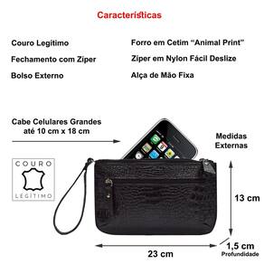 Bolsa clutch, carteira de mão e porta celular em COURO 100% autêntico, muito versátil e prática, possui 1 bolso externo fechado por zíper para pequenos objetos, todos os metais (argola, mosquetões, zíperes, etc) são na cor prata. O fechamento principal é feito com zíper em nylon de fácil deslize. Possui alça externa de mão, excelente para uso no dia a dia. Possui a medida ideal para levar pequenos objetos, carteiras pequenas, celulares de tamanhos médio e grande, etc.