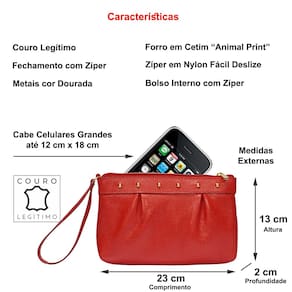 Bolsa clutch, carteira de mão e porta celular em COURO, delicada, elegante, moderna e prática, possui 1 bolso interno fechado por zíper para pequenos objetos, todos os metais (argola, mosquetões, zíperes, etc) são na cor dourada. O fechamento principal é feito com zíper em nylon de fácil deslize. Possui alça fixa externa de mão. Ela tem a medida ideal para levar pequenos objetos, carteiras pequenas, celulares de tamanhos médio e grande, etc.