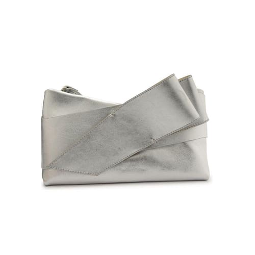 Dimensões: 4X10,5X20 cm Descrição: Bolsa clutch pequena prata de couro. O modelo tem formato retangular. Possui alça tiracolo longa, regulável e removível e fecho em tampo e imã. Com aplicação de metal geométrico e vazado na capa. Interno com bolso e porta-cartões. Referência: A5001807460004