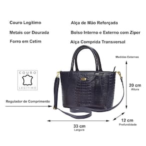 Bolsa Média Feminina Estruturada para uso na Mão, Tiracolo ou Transversal em Couro Madamix Esse modelo de bolsa nos últimos anos passou a ser a queridinha das brasileiras, além de prática ela é moderna e elegante. Possui alça curta para uso na mão e alça comprida para uso tiracolo ou transversal. Sua alça comprida pode ser removida, caso necessário, e possui regulador de comprimento para melhor ajuste ao seu tamanho corporal. Ideal para o dia a dia ou em produções casuais que necessitem de estilo sem abrir mão da elegância. Na parte traseira possui 1 bolso fechado por zíper com tamanho médio que cabe celulares, chaves e pequenos objetos. Todos os metais são dourados para combinar com a sofisticação e elegância que um produto em couro merece. O acabamento interno é em forro de cetim, com texturas variadas tipo animal print (padrão oncinha) ou similar. Na parte interna possui um bolsinho fechado por zíper para pequenos objetos, moedas etc. O fechamento da parte superior é feito com zíper de nylon de excelente qualidade que proporciona um fácil deslize e resistência.