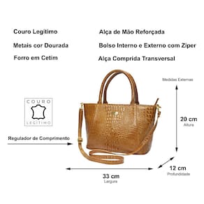 Esse modelo de bolsa nos últimos anos passou a ser a queridinha das brasileiras, além de prática ela é moderna e elegante. Possui alça curta para uso na mão e alça comprida para uso tiracolo ou transversal. Sua alça comprida pode ser removida, caso necessário, e possui regulador de comprimento para melhor ajuste ao seu tamanho corporal. Ideal para o dia a dia ou em produções casuais que necessitem de estilo sem abrir mão da elegância. Na parte traseira possui 1 bolso fechado por zíper com tamanho médio que cabe celulares, chaves e pequenos objetos. Todos os metais são dourados para combinar com a sofisticação e elegância que um produto em couro merece. O acabamento interno é em forro de cetim, com texturas variadas tipo animal print (padrão oncinha) ou similar. Na parte interna possui um bolsinho fechado por zíper para pequenos objetos, moedas etc. O fechamento da parte superior é feito com zíper de nylon de excelente qualidade que proporciona um fácil deslize e resistência.