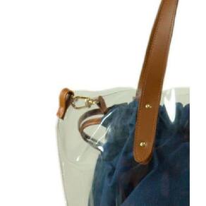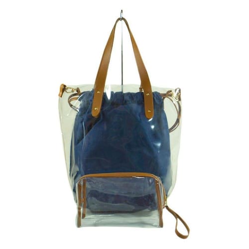 Bolsa Cristal Jeans + Necessaire Com design diferente e moderno, essa bolsa pode ser usada de diversas formas. Feita em vinil transparente com acabamento em tecido sintético caramelo. Por dentro possui uma sacochila na cor jeans que também pode ser usada separadamente. A necessaire combinando com a bolsa pode ser usada em conjunto com a sacochila interna ou apenas com a bolsa cristal, dando um lindo visual para sua bolsa. Ótima opção para praia, piscina, academia ou para ocasiões sociais. CARACTERÍSTICAS