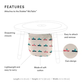 Stokke Sacos de Armazenamento de Brinquedos para Carros - Bolsa de armazenamento de brinquedos – A bolsa de algodão Stokke MuTable é uma bolsa de armazenamento de brinquedos macia que mantém seus acessórios MuTable organizados. Os laços são fáceis de fixar e remover dos ganchos na mesa, e o conveniente fecho de cordão ajuda a evitar bagunças futuras. - Fácil de limpar – Quando colocado sob a abertura central do muTable, é fácil para o seu filho deslizar todos os brinquedos na bolsa de algodão e então a arrumação é feita. Torna a limpeza divertida! - Estrutura leve – Leve e fácil de transportar, a bolsa de algodão MuTable é o acessório ideal para armazenar e organizar brinquedos pequenos e médios. Disponível em uma ampla variedade de cores e padrões divertidos para complementar sua sala de jogos. - Design com um propósito – a Stokke entrou no setor de móveis e acessórios infantis em 1972 e, desde então, todos os nossos produtos foram projetados para desafiar o comum, promover o desenvolvimento saudável e estimular o vínculo familiar.