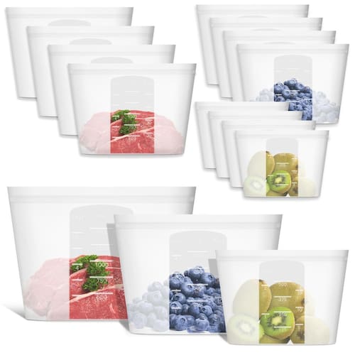 Bolsa de armazenamento reutilizável, pacote com 12 sacos de armazenamento de alimentos 100% silicone, sacos de silicone com zíper para recipiente de alimentos, freezer, micro-ondas, lava-louças, 4, grandes, 4, médias, 4, pequenas, translúcidas - ?100% silicone – seguro e confiável?Feito de silicone 100% de grau alimentício, nossos sacos ziplock para lanches são livres de PVC, cloro, ftalatos e BPA. Não tóxico e inodoro, eles oferecem armazenamento seguro de alimentos para sua família. Projetado com durabilidade em mente, seu material espesso e estrutura resistente garantem uso duradouro. Leve e conveniente para o uso diário, eles são a solução de armazenamento ideal - ?Seguro para forno de micro-ondas e congelador de louças?Cansado de lidar com sacos plásticos? (PEVA é na verdade um tipo de plástico.) Mude para sacos de silicone reutilizáveis e passe menos tempo se preocupando em salvar as sobras com segurança. Estes sacos reutilizáveis não são tóxicos e seguros para uso no micro-ondas, freezer, forno e máquina de lavar louça. Eles podem até suportar temperaturas de até 220 °C, tornando-os ideais para todas as suas necessidades de armazenamento de alimentos - ?Design com fecho de zíper e suporte?Estas bolsas de silicone reutilizáveis apresentam um fecho de zíper sem complicações para abrir e fechar sem esforço - não precisa se preocupar em perder tampas irritantes! Seu design em pé permite que você faça várias tarefas, liberando uma mão para cuidar do seu pequeno com facilidade. Além disso, o material flexível também os torna extremamente fáceis de usar e pressionar o ar antes de selar ajuda a economizar espaço valioso - ?Pensado e econômico?Você receberá 4 tamanhos grandes de 1,5 litros/6 xícaras/1500 ml, 4 tamanhos médios 1000 ml (tamanho de litro para sanduíche) e 4 lanches pequenos de 2 xícaras/500 ml. Os sacos de armazenamento de alimentos de silicone reutilizáveis vêm com marcas de volume nítidas em copos, mililitros e onças fluidas para facilitar o uso. Corpo translúcido fácil de ver o que está dentro, embora não seja cristalino. Além disso, uma bolsa de silicone pode reduzir até mais de 300 sacolas plásticas de uso único por ano, ajudando a criar um mundo livre de desperdício - ?Uso versátil?Nossos pequenos sacos reutilizáveis para alimentos são perfeitos para congelar, cozinhar e armazenar alimentos, frutas, saladas, lanches de vegetais ou sobras, tornando-o conveniente para levar seu almoço para o trabalho, escola, um piquenique, uma caminhada ou acampamento. Ideal para refeições em movimento ou preparação simples de almoço, eles também podem ser utilizados para cosméticos, artigos de papelaria, brinquedos, materiais de tricô, material de escritório, joias e muito mais - perfeitos para adultos, crianças e até bebês. Lembrete: mantenha na vertical para líquidos para evitar possíveis vazamentos nos cantos; não para sous vide
