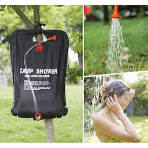 Dicas quentes: 1. Por favor, aperte a tampa após encher a água para evitar vazamentos 2. A temperatura de aquecimento não deve exceder 122° F 3. Verifique se a temperatura da água é adequada antes de usar, se estiver muito quente, adicione um pouco de água fria 4. Não beba, quando não estiver em uso, despeje a água Especificações: Nome do item: saco de chuveiro solar Material: PVC Cor: preto Capacidade de água: 5 galões/20 l Tamanho do pacote: 12 x 5,5 x 2,8 polegadas Peso do pacote: 0,7 libras Lista de pacotes: 1 x saco de chuveiro solar 1 x cabeça de chuveiro 1 x válvula de saída 1 x barra estabilizadora de PVC 1 x mangueira 1 x funda de gancho suspenso -?Grande capacidade?- Você receberá 1 pacote sacos de chuveiro solares com uma grande capacidade de água de 5 galões/20L, o suficiente para cerca de 1 ou 2 chuveiros. O fluxo de água é fino e suave, proporcionando uma melhor experiência de banho! -?Material durável?- O chuveiro solar usa uma alça resistente e um tubo de plástico reforçado e é feito de material de PVC durável, que não é tóxico e ecológico, durável e não se deforma facilmente. -?Design de absorção de calor?- Sob luz solar direta, a bolsa de banho de acampamento pode aquecer água a 105° F (40° C) em apenas 3 horas. Não há necessidade de gás ou eletricidade para desfrutar de um banho quente ao ar livre! -?Fácil de usar?- É projetado com um interruptor ajustável liga/desliga para controlar o fluxo de água. A funda de gancho suspenso pode ser facilmente pendurada em uma árvore ou barraca de banho para lavar seu corpo, rosto, mãos ou lavar pratos, comida, carros, etc. -?Camping to Glamping?- Ela permite que você desfrute de um banho refrescante e agradável durante o rafting, acampamento, pesca ou caça. Você também pode levá-lo à praia no verão e lavar o sal e a areia depois de nadar.