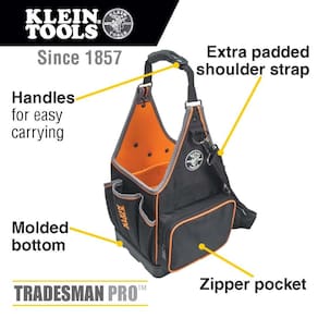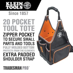 Klein Tools Bolsa de ferramentas 554158-14, sacola profissional Tradesman com 20 bolsos feita de trama balística 1680d e uma parte inferior totalmente moldada, 20 cm - Organizador de ferramentas com um grande bolso com zíper para proteger peças pequenas e ferramentas - 20 bolsos para maior armazenamento de ferramentas - Fundo totalmente moldado para estabilidade e protege contra os elementos - Interior laranja para encontrar ferramentas mais rápido - Tecido balístico 1680d para maior durabilidade - Alça de ombro com acolchoamento extra e alças para facilitar o transporte