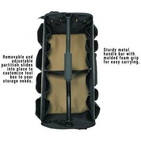 DIVISÓRIA AJUSTÁVEL Esta caixa de ferramentas de lado macio e resistente apresenta uma partição removível e ajustável que desliza no lugar para personalizar esta caixa de ferramentas de acordo com suas necessidades de zenamento. CAIXA DE FERRAMENTAS COM 27 BOLSOS 12 bolsos no exterior, 15 bolsos no interior e 6 mangas de teia nesta caixa de ferramentas de lado macio da CLC proporcionam zenamento e organização para as suas ferramentas manuais favoritas. CONFORTÁVEL DE CARREGAR Esta caixa de ferramentas possui uma alça de ombro ajustável acolchoada para maior conforto durante o transporte. CAIXA DE FERRAMENTAS ROBUSTA MACIA Uma barra de alça de metal resistente com alça de espuma moldada está integrada a esta caixa de ferramentas para facilitar o transporte Marca: Não Informado