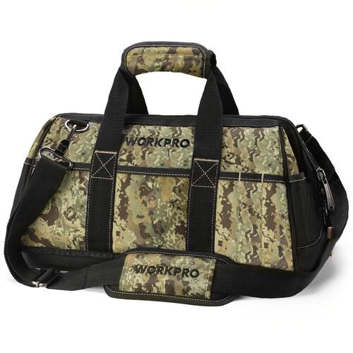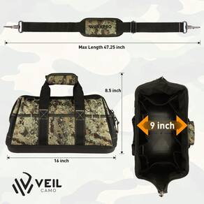 WORKPRO Bolsa de ferramentas de boca larga de 40,6 cm, bolsa de ferramentas masculina com alça de ombro ajustável, tecido Oxford impermeável e botão resistente - Resistente e confiável: feita de tecido Oxford resistente 400 x 400D de alta qualidade, esta bolsa de ferramentas é resistente e à prova d'água. A base de plástico costurada reforçada e os zíperes fortes garantem que ela possa suportar cargas pesadas, tornando-a perfeita para locais de construção, oficinas e projetos ao ar livre - 22 bolsos e 8 cintos laterais: o interior grande das bolsas de ferramentas oferece amplo espaço para todas as suas ferramentas. Com 13 bolsos externos, 9 bolsos internos e 8 laços externos para pendurar, você pode manter seu equipamento organizado e seguro, garantindo fácil acesso a chaves de fenda, chaves, alicates e outros acessórios - Capacidade de carga de 15 kg. As bolsas de ferramentas masculinas são projetadas para suportar até 15 kg com facilidade. Se você estiver embalando com ferramentas pesadas, equipamentos elétricos ou uma variedade de ferramentas manuais, você pode carregar tudo o que precisa sem se preocupar - Boca larga: o design de boca larga reforçada com fio de aço permite que a bolsa de ferramentas do eletricista permaneça aberta, oferecendo fácil acesso para carregar e descarregar suas ferramentas de forma rápida e sem esforço - Alça de ombro ajustável: a alça de ombro ajustável com acolchoamento extra torna fácil e confortável de carregar, mesmo quando a bolsa de ferramentas está totalmente carregada. As alças acolchoadas oferecem conforto adicional durante o transporte - Design colaborativo VEIL: com um padrão de camuflagem exclusivo, esta faca dobrável oferece uma aparência elegante, tornando-a o presente perfeito para entusiastas de atividades ao ar livre