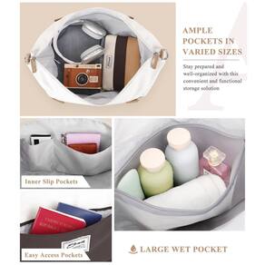- Muitos bolsos para todas as suas necessidades: mantenha tudo limpo e estiloso com nossas versáteis bolsas de fim de semana para mulheres. Tem um bolso interno, uma bolsa úmida espaçosa com zíper, dois bolsos laterais para garrafas de água, um bolso frontal para acesso rápido, um bolso traseiro seguro com zíper para chaves e um compartimento de sapatos separado para manter seus sapatos separados