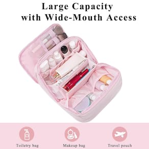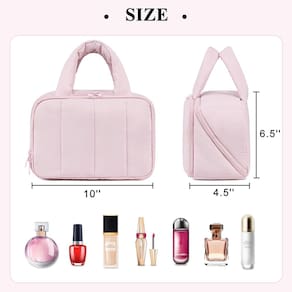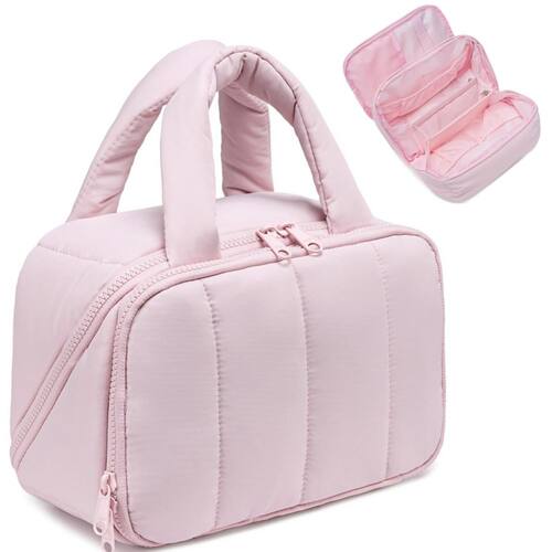 Camtop Bolsa de Higiene Pessoal de Viagem para Mulheres Organizador de Higiene Pessoal Leve Grande Aberta Bolsa de Maquiagem Grande Capacidade Qulited Bolsa de Cosméticos Puffy para Essentials Organizer - Grande capacidade: bolsa de higiene de viagem CAMTOP com uma dimensão ideal 16,5 x 25,4 x 11,4 cm (A*C*L). Cinco compartimentos atendem a todas as suas necessidades de armazenamento. Um compartimento principal de grande capacidade pode manter todos os seus itens essenciais de viagem organizados e um bolso frontal com zíper aberto pode ser totalmente aberto em 180°, bom para escovas de cosméticos, escova de dentes, creme para as mãos, chaves, carteiras e outras ferramentas, etc. - Separação eficiente de seco-molhado: Feita com tecido de PVC à prova d'água, esta bolsa de higiene grande é projetada para manter os itens úmidos e secos separados, garantindo limpeza e organização durante suas viagens. O bolso frontal com zíper é um bônus adicional, facilitando o armazenamento e o acesso a itens menores, mantendo a separação do conteúdo úmido e seco. - Design aberto: o design de dupla face totalmente aberta mantém os frascos de cosméticos em pé no compartimento do meio. A bolsa de maquiagem aberta é projetada com dois zíperes, permitindo que você encontre itens rapidamente. As camadas intermediárias no compartimento são zíperes e o design multicamadas mantém seus itens organizados. Basta puxar os zíperes conectados, seus itens podem ser facilmente armazenados em um instante. - Materiais e alça leves e macios: O design especial de enchimento acolchoado é muito moderno e leve. Feito de material acolchoado macio e luxuoso. Este organizador de artigos de higiene pessoal para viagem parece algodão doce, dando às pessoas uma atmosfera descontraída e confortável. A alça de algodão de alta qualidade permite que você a levante muito confortavelmente e macia, elegante e prática. - Multifuncional: ideal para viajantes, esta bolsa de higiene pode ser como uma bolsa de cosméticos ou organizador de banheiro, tornando-a perfeita para viagens de negócios, férias e atividades ao ar livre. Adequado para sua viagem de negócios ou férias de fim de semana. Definitivamente um presente de Natal ideal para você, sua família e seus amigos.