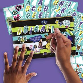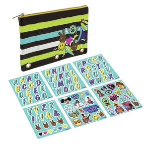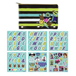 — Inclui uma bolsa colorida com zíper e mais de 100 adesivos de vinil para personalizar o material escolar e mostrar criatividade.