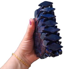 Bolsa confeccionada com pecinhas de madeira no formato de pequenos losângulos, pintados e envernizados, cor Azul, com acabamento interno em cetim e fechamento com zíper.