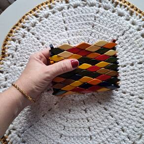 Bolsa confeccionada com pecinhas de madeira no formato de pequenos losângulos, pintados e envernizados, Colorida, com acabamento interno em cetim e fechamento com zíper.