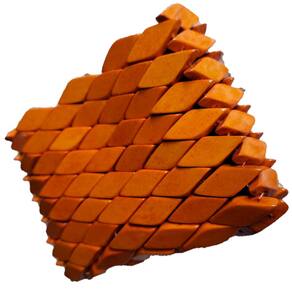 Bolsa confeccionada com pecinhas de madeira no formato de pequenos losângulos, pintados e envernizados, cor Madeira Clara, com acabamento interno em cetim e fechamento com zíper.
