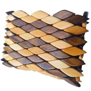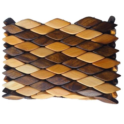 Bolsa confeccionada com pecinhas de madeira no formato de pequenos losângulos, pintados e envernizados, cor Marrom-Marfim, com acabamento interno em cetim e fechamento com zíper.