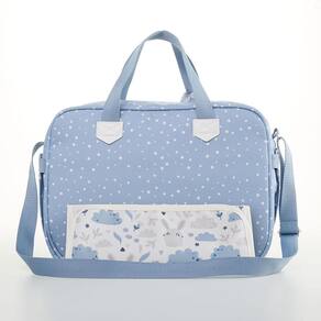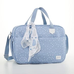 Compartimento principal com bolso plástico com fecho em zíper para roupinhas sujas. Na parte exterior, além de dois bolsos laterais ajustáveis com elástico para mamadeiras e copinhos, possui bolso frontal para pequenos objetos. As alças de mão e de ombro em fita e a bolsa acompanha trocador na mesma estampa. Coleção em oxford, com mix de estampas, nas cores cinza, azul e rosa. Possui forro emborrachado e impermeável. Acompanha lenço delicado com estampa exclusiva em todas as peças.