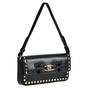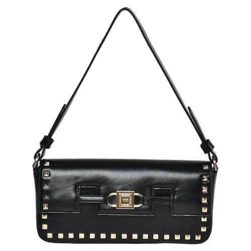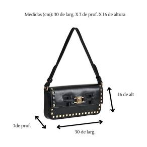 Bolsa de ombro feita em PU estruturado. Possui alça de ombro fixa com argola de metal personalizada. Lapela com aplicações de spikes e recortes. Abertura principal com botão magnético. Peça forrada com bolso interno de zíper. Etiqueta patch na parte interna. Placa frontal Via Marte de metal com alto relevo.
