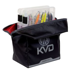 Plano Bolsa Speedbag KVD Wormfile Signature Series 3600, tecido preto revestido de TPE com interior e detalhes vermelhos, bolsa de pesca macia premium, armazenamento para iscas e iscas